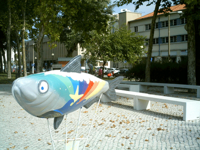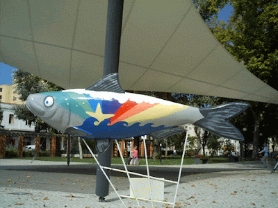 Found three photos I took in the Summer. This exhibition was on display in our public garden for maybe two or three months. I think these fish were painted by children with some help from local plastic artists.